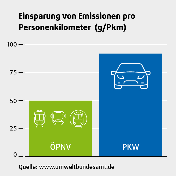 Tschüss Luftverschmutzung. Hallo Aufatmen! Neben der CO₂-auch für sauberere Luft. Er spart durchschnittlich 36% Stickoxide und 50% Feinstaub gegenüber dem Individualverkehr. Im Vergleich zu einer Fahrt mit dem PKW bedeutet das je gefahrenem Kilometer im Schnitt rund 14 Gramm weniger Luftschadstoffe.