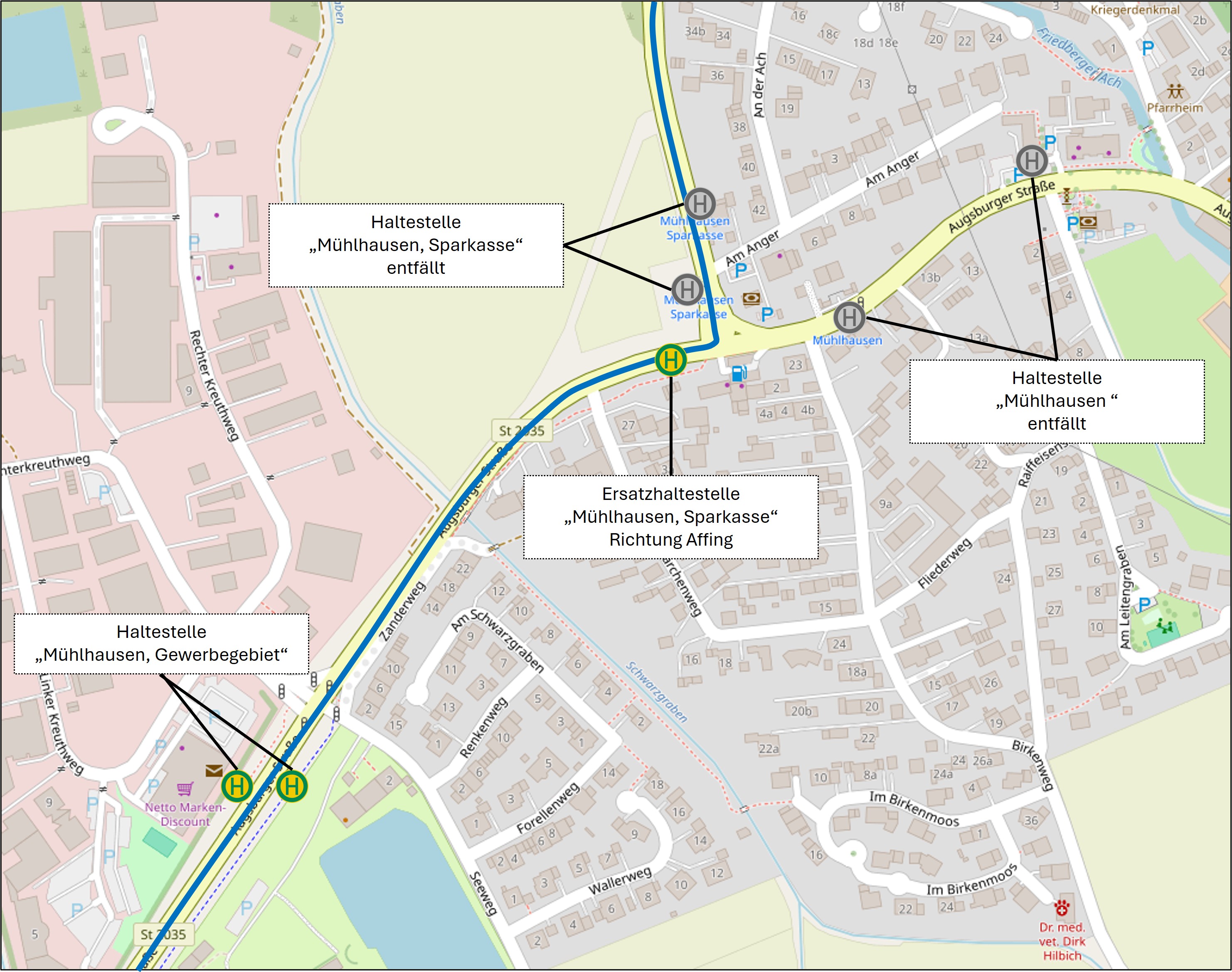 Für Steig E können die Fahrgäste auf die Haltestelle „Mühlhausen, Gewerbegebiet“ ausweichen - Linien auf der Achse Augsburg – Affing bedienen die Haltestelle „Bergen“ an der Haltestelle S2.