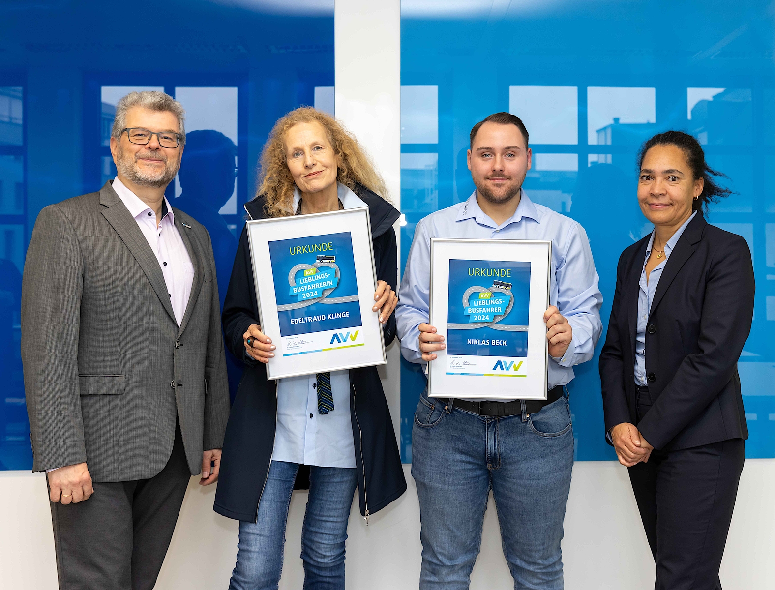Im vergangenen Jahr hat eine Initiative aus Fahrgastverband PRO BAHN, DB Regio, Verband Deutscher Verkehrsunternehmen (VDV) und Bundesverband Deutscher Omnibusunternehmen (bdo) den Wettbewerb „LieblingsbusfahrerIn“ ins Leben gerufen. Bundesweit gingen dafür Vorschläge von Fahrgästen auf der Website www.lieblingsbusfahrerin.de ein. Aus den Vorschlägen aus der AVV-Region wurden Klinge und Beck als Preisträger vom AVV ausgewählt.